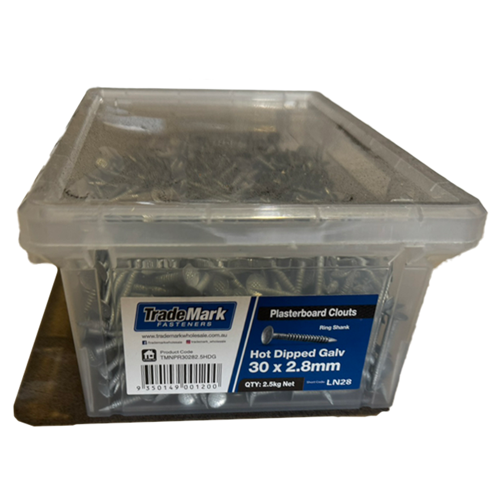 Galvanised plasterboard clouts are traditional fixings used for securing plasterboard to timber framing, particularly in ceiling and wall applications. Manufactured from zinc-coated steel, they offer corrosion resistance and a strong hold, making them suitable for internal installations in residential and light commercial projects.